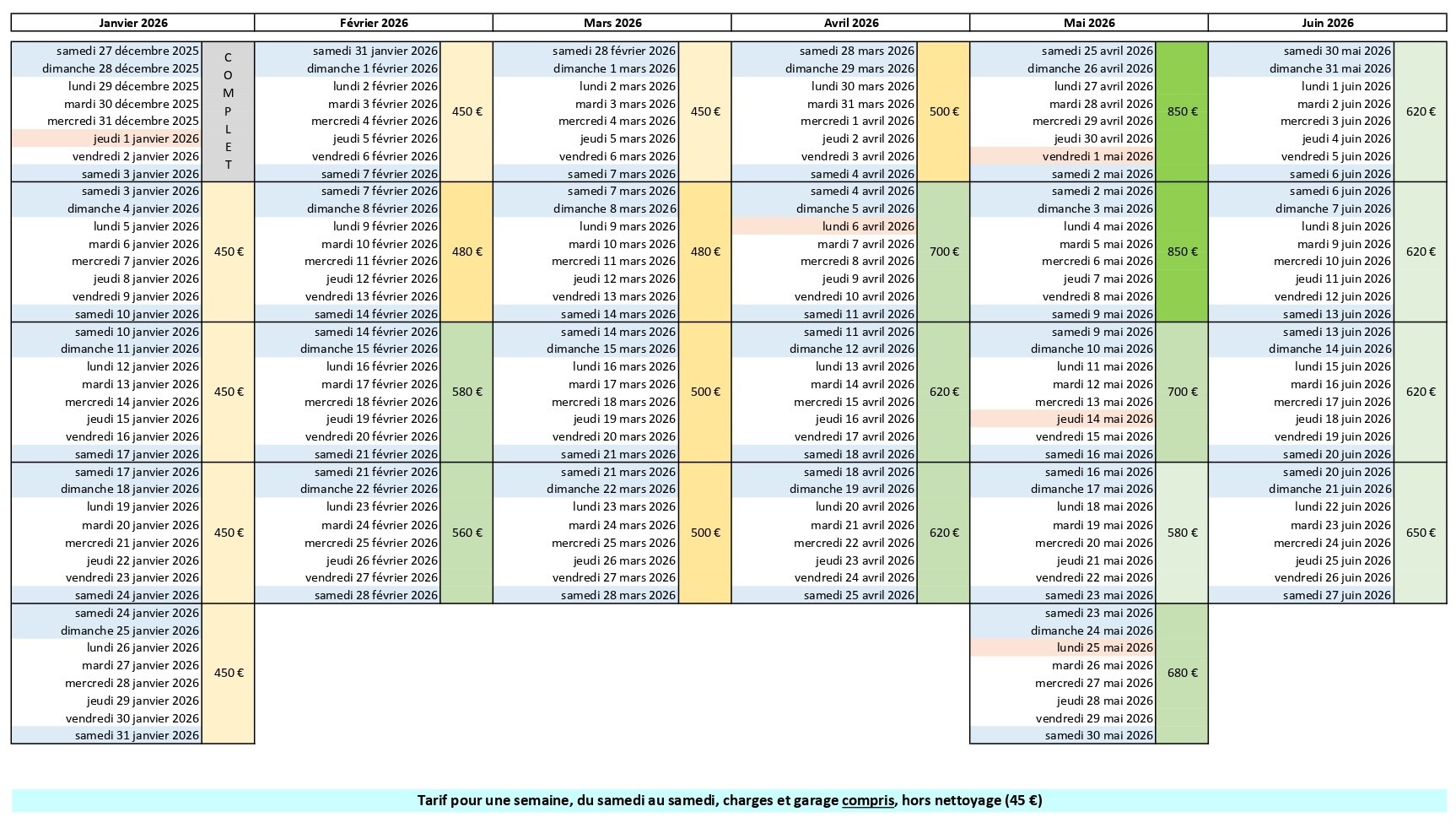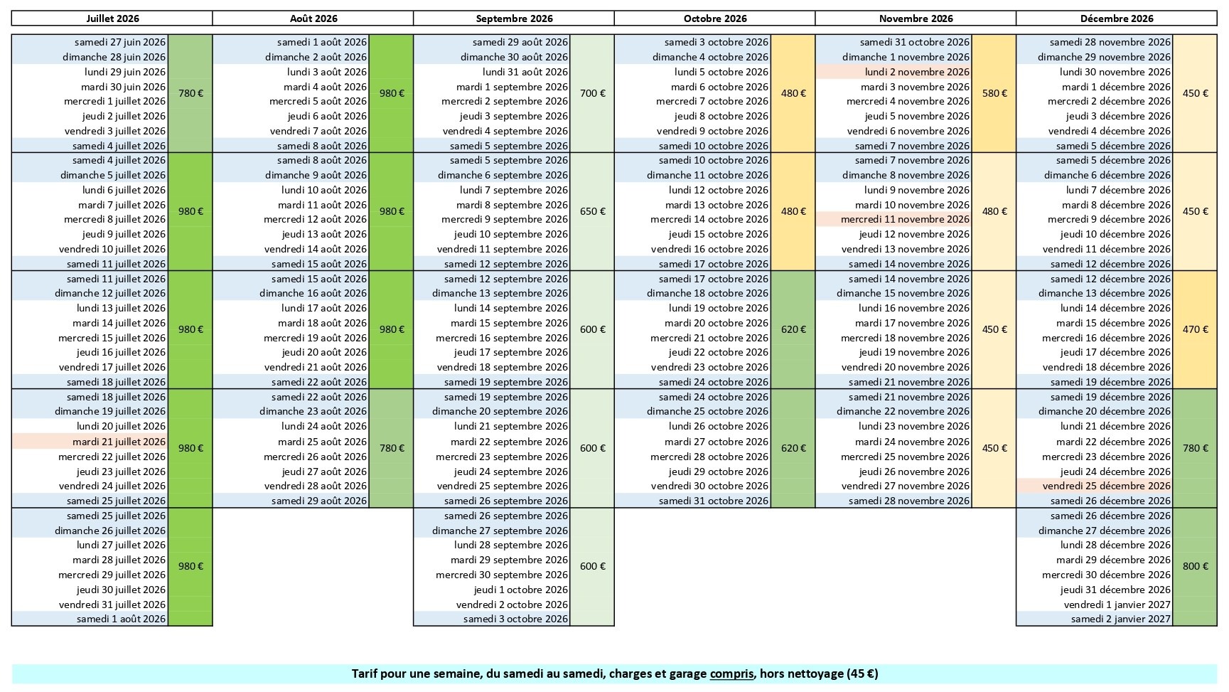 Tarif pour une semaine du samedi au samedi pour l'année 2026